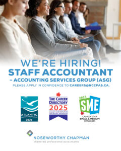 Noseworthy Chapman Chartered Professional Accountants is excited to announce an opening for a permanent, full-time Staff Accountant in our Accounting Services Group (ASG) based in St. John’s, NL.